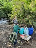 Comme chaque vendredi matin, les 23 élèves de GS-CP empruntent le chemin entre Pont Kervern et la voie verte pour s’installer dans la petite clairière bordée par le Ruisseau de Guengat et participer à leur « classe dehors ». Les PS vont par équipe de 2 se mettre en quête d’un élément naturel commençant par une lettre donnée de l’alphabet, lequel sera photographié et exposé dans la classe. Pour la lettre D ce sera l’image d’un arbre déraciné au bord de la rivière. Les CP vont devoir résoudre l’énigme du nombre de pétales d’une fleur donnée et de leur total quand elles sont trois. « Trente deux », estime Maïna. « Comment ça s’écrit ? – Un deux et un trois », répond Amaro. Et Zaïg d’écrire sur son ardoise : 23 ! D’ici la fin du CP, ce sera rentré dans l’ordre…